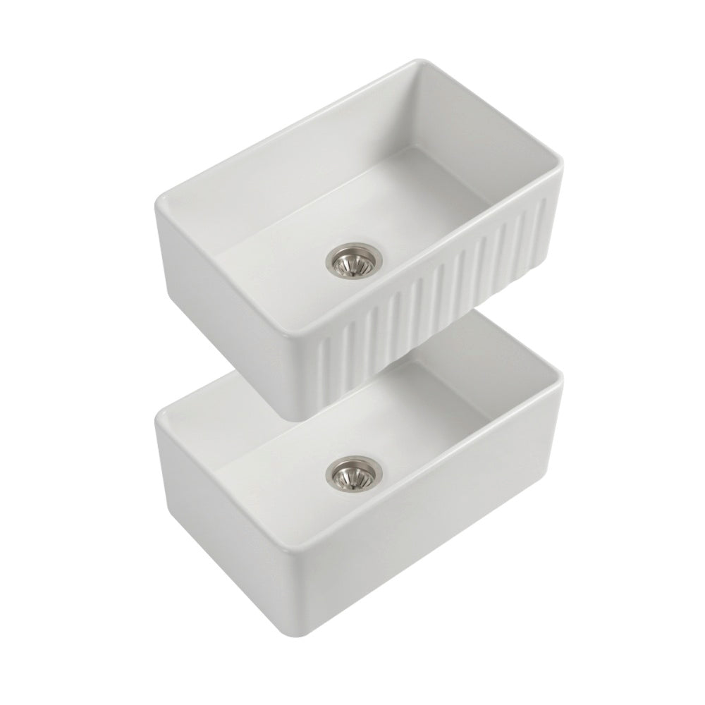 Cleo double-sided ceramic apron front sink are designed to be installed with the front of the sink exposed. You can choose to expose the fluted side or the flat side, depending on your chosen style aesthetic.