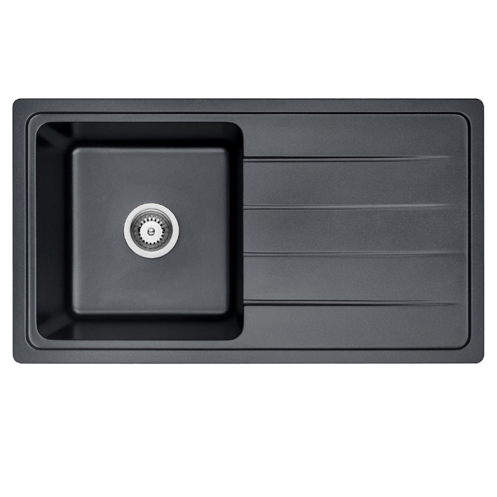 Amelie Deauville Kitchen Sink Quartz Single Bowl with Drainer Topmount 864x484x235mm (No Overflow) Matte Black BDOFORSB864BL