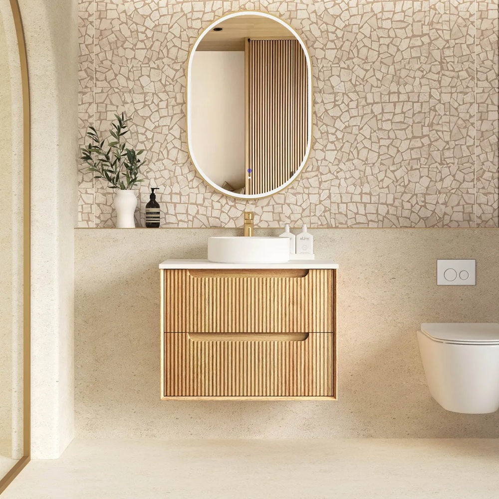 The Byron vanity features a natural oak finish, high moisture resistant plywood construction, soft edge finger pull handles, and Hettich hinges and runners for smooth and soft closing. The new Fluted veneer showcases detailed fine lines that add elegance to you designer bathroom.