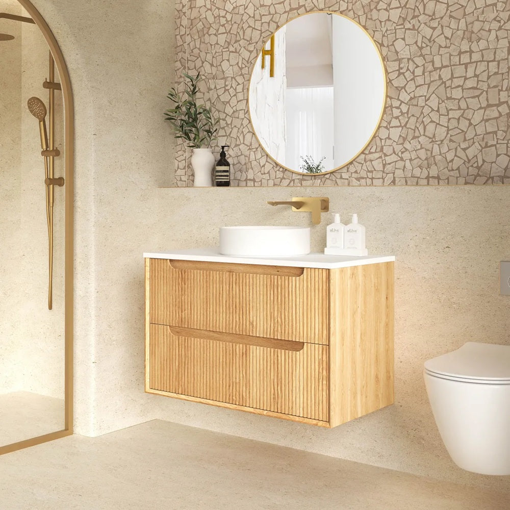 Otti Byron Wall Hung Vanity Fluted 900mm Woodland Oak w/ Cloudy Carrara Top BYW900LSTUD-CA