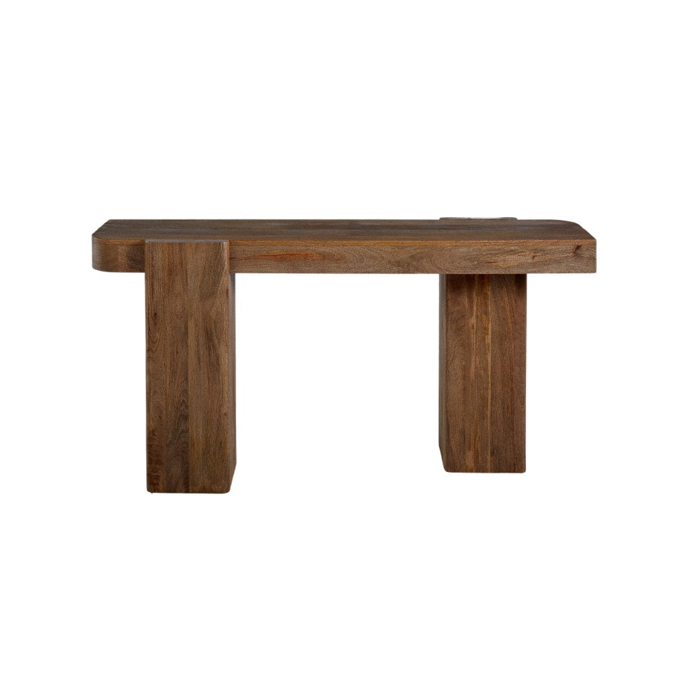Handcrafted from mango wood, known for its durability and rich natural hues, it displays a rectangular top and abstract legs.