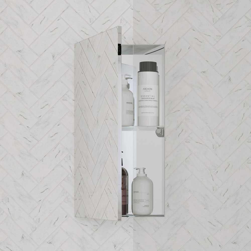 Installation: InvisiCab sizes is designed to fit within the timber stud wall at the time of construction or renovation of your bathroom. Once installed inside the timber frame, the wall is then waterproofed and tiled to give a sleek, invisible‑look for your storage cabinet.