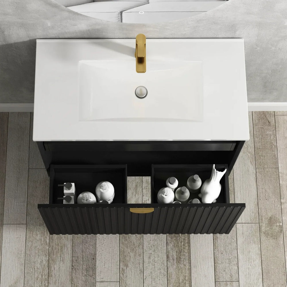 Otti Marlo Wall Hung Vanity 900mm Matte Black w/ Natural Carrara Marble Top MA900BSTUD-NCA